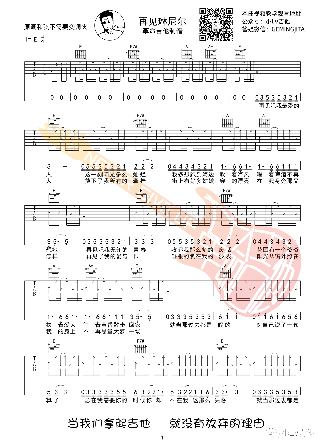 再见琳尼尔吉他谱,革命吉他教室歌曲,简单指弹教学简谱,E调原调版吉他弹唱谱