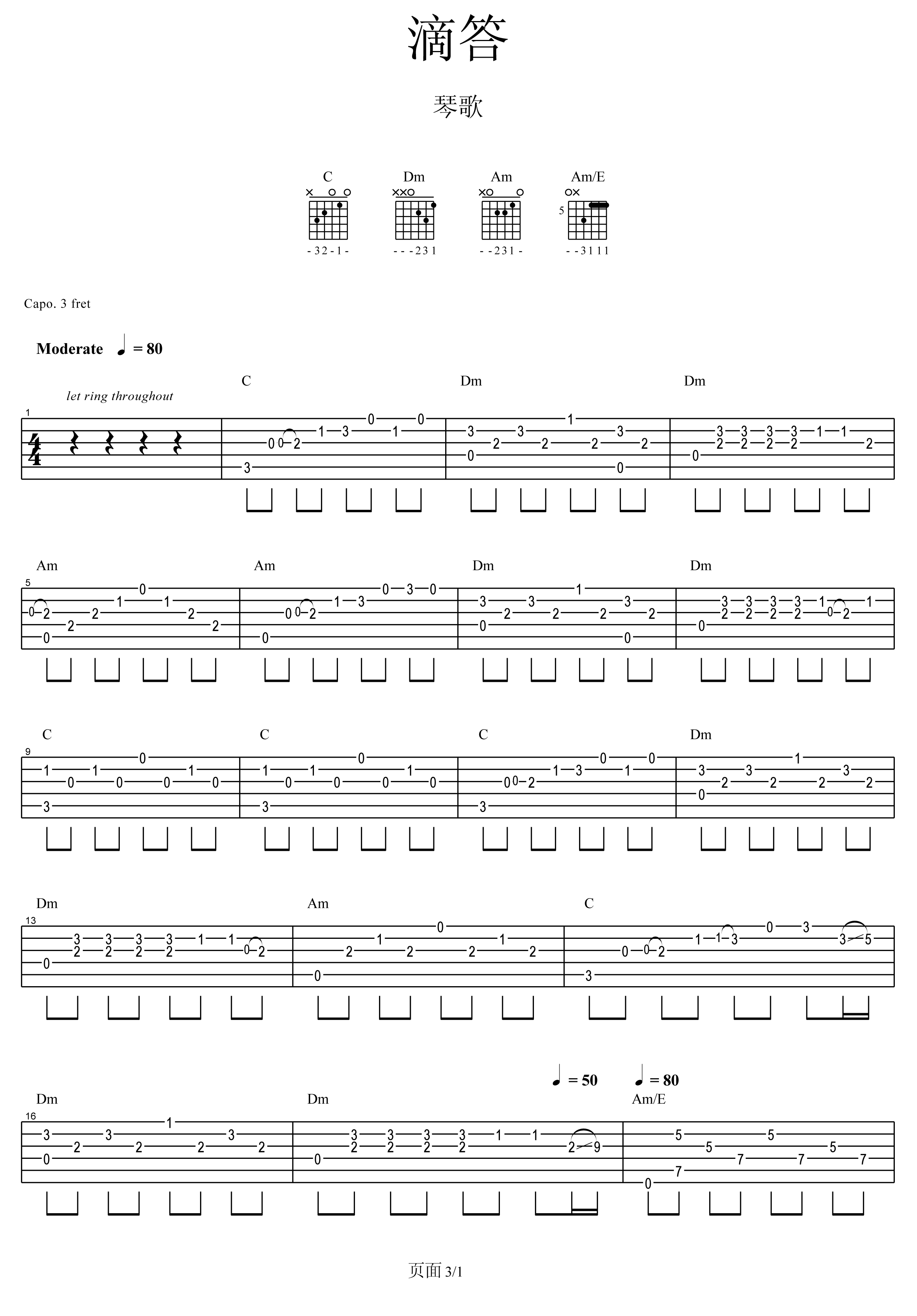 《侃侃《滴答》琴歌版指弹独奏吉他六线谱_C调吉他谱分享,此次带来琴歌版本的《滴答》指弹吉他谱,此版本仍然采用我们最熟悉的C调指法编配,另外谱子上还把每小节的和弦给我们注明出来了,这也大大的方便了我们的弹奏,但是在弹的时候还是要注意下除了和弦之外的和弦外音。