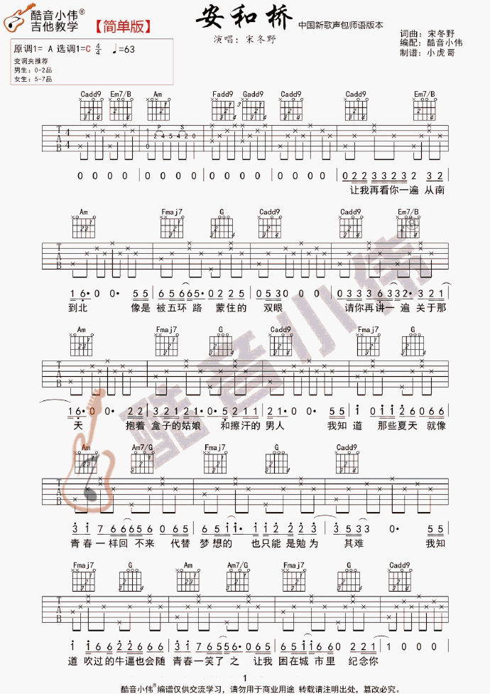 安和桥吉他谱,原版宋冬野歌曲,简单C调指弹曲谱,高清六线乐谱