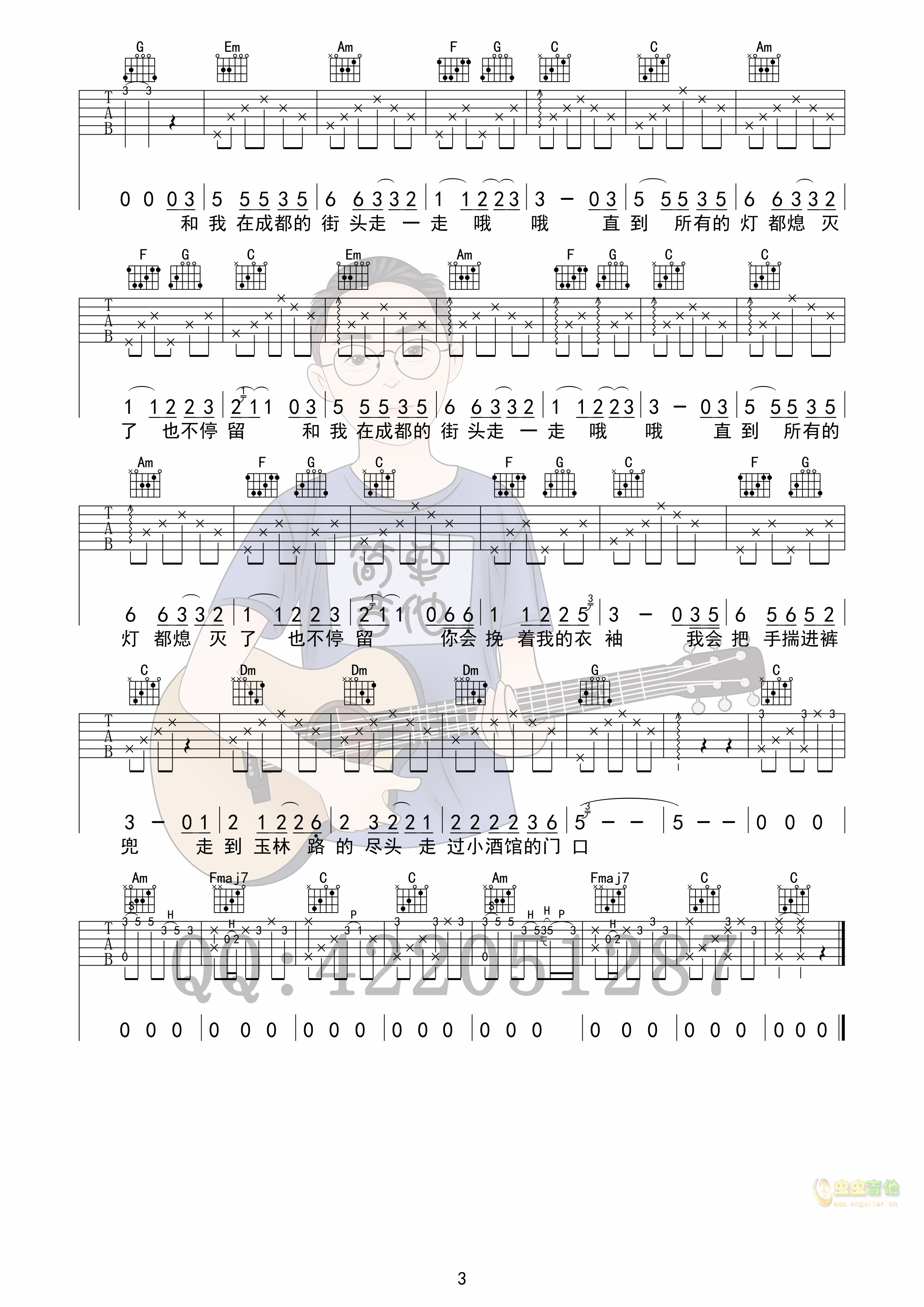 成都吉他谱,原版歌曲,简单C调弹唱教学,六线谱指弹简谱3张图