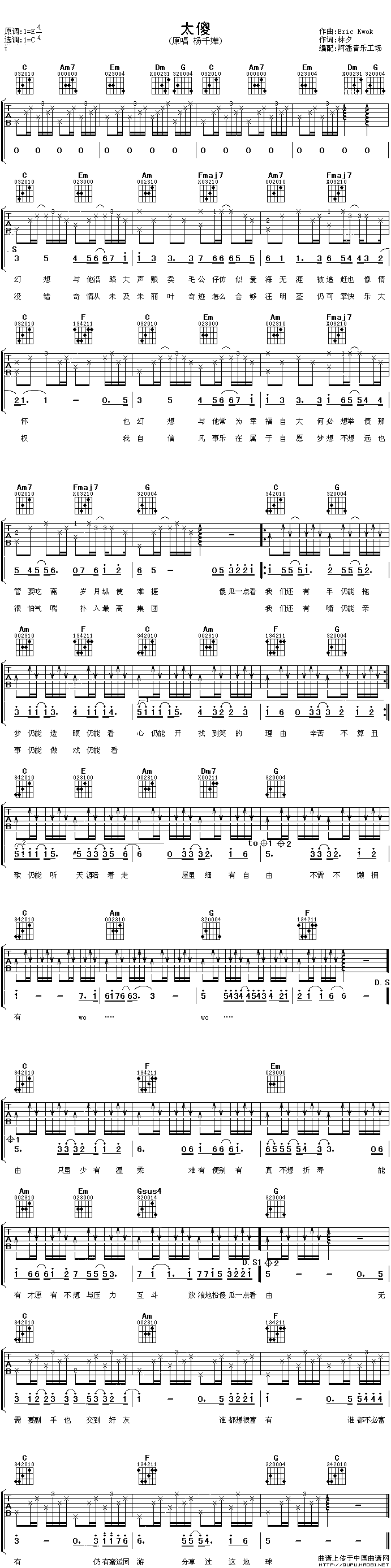 大傻吉他谱,它是杨千桦演唱的歌曲,由阿潘音乐工场编配制谱,是一首经典歌曲编配的C调指弹编配的曲谱,