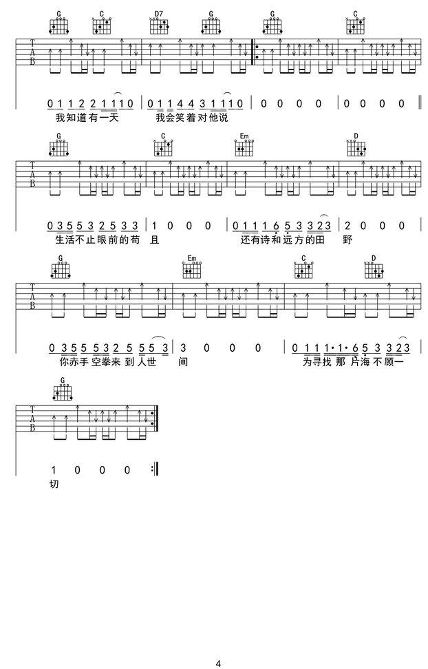 生活不止眼前的苟且吉他谱,原版歌曲,简单A调弹唱教学,六线谱指弹简谱4张图