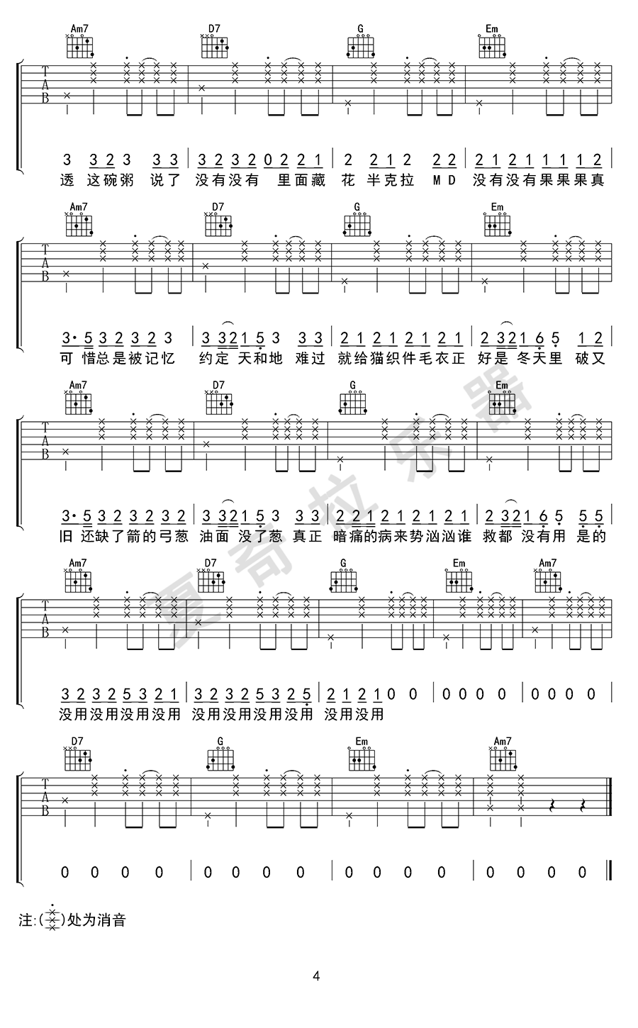 静止吉他谱,原版歌曲,简单G调弹唱教学,六线谱指弹简谱4张图