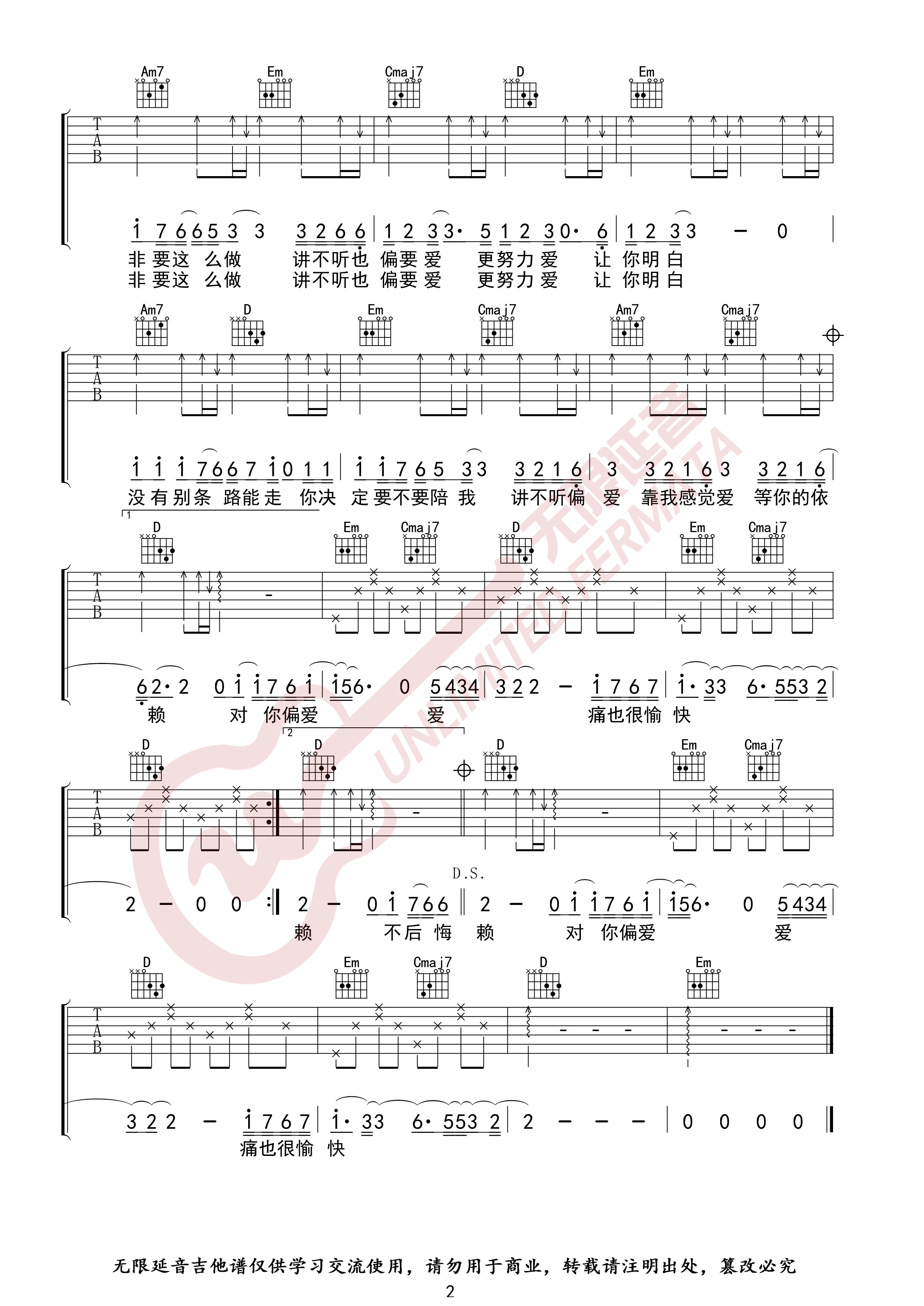 偏爱吉他谱,原版歌曲,简单未知调弹唱教学,六线谱指弹简谱2张图