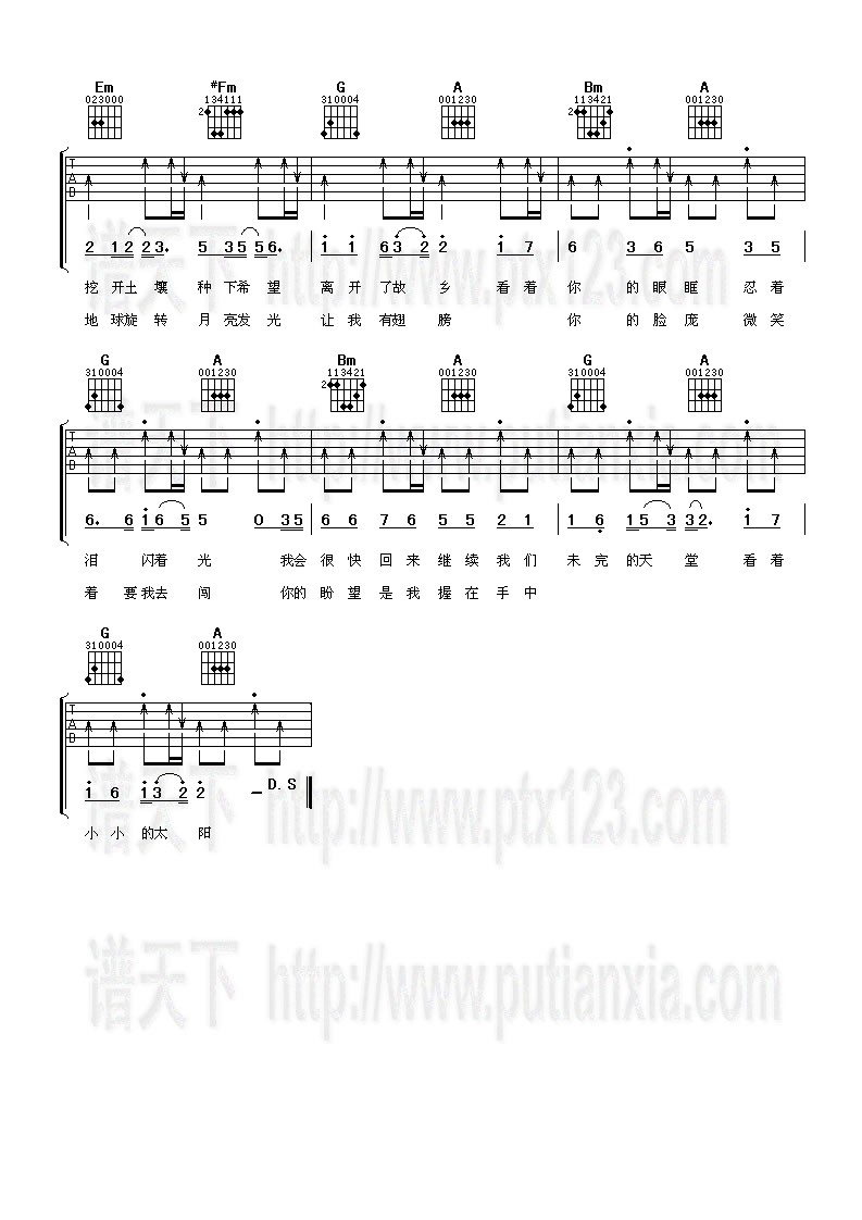 《小太阳》吉他谱,由五月天演唱的,流行弹唱,小太阳六线谱,C调制法,一共2张高清弹唱图片谱,采用'4/4拍子,拍速为60-80,单吉他,弹奏难度为:简单,吉他部落 jita2012.com整理上传。小太阳 吉他简谱小太阳 歌词多麽难忘 是你纯真的模样突然的吻 弥漫着茶香多麽向往 梦想总是在他方你说等我 不管多漫长你就是太阳 蒸发了彷徨所以挖开土壤 种下希望 离开了故乡看着你的眼