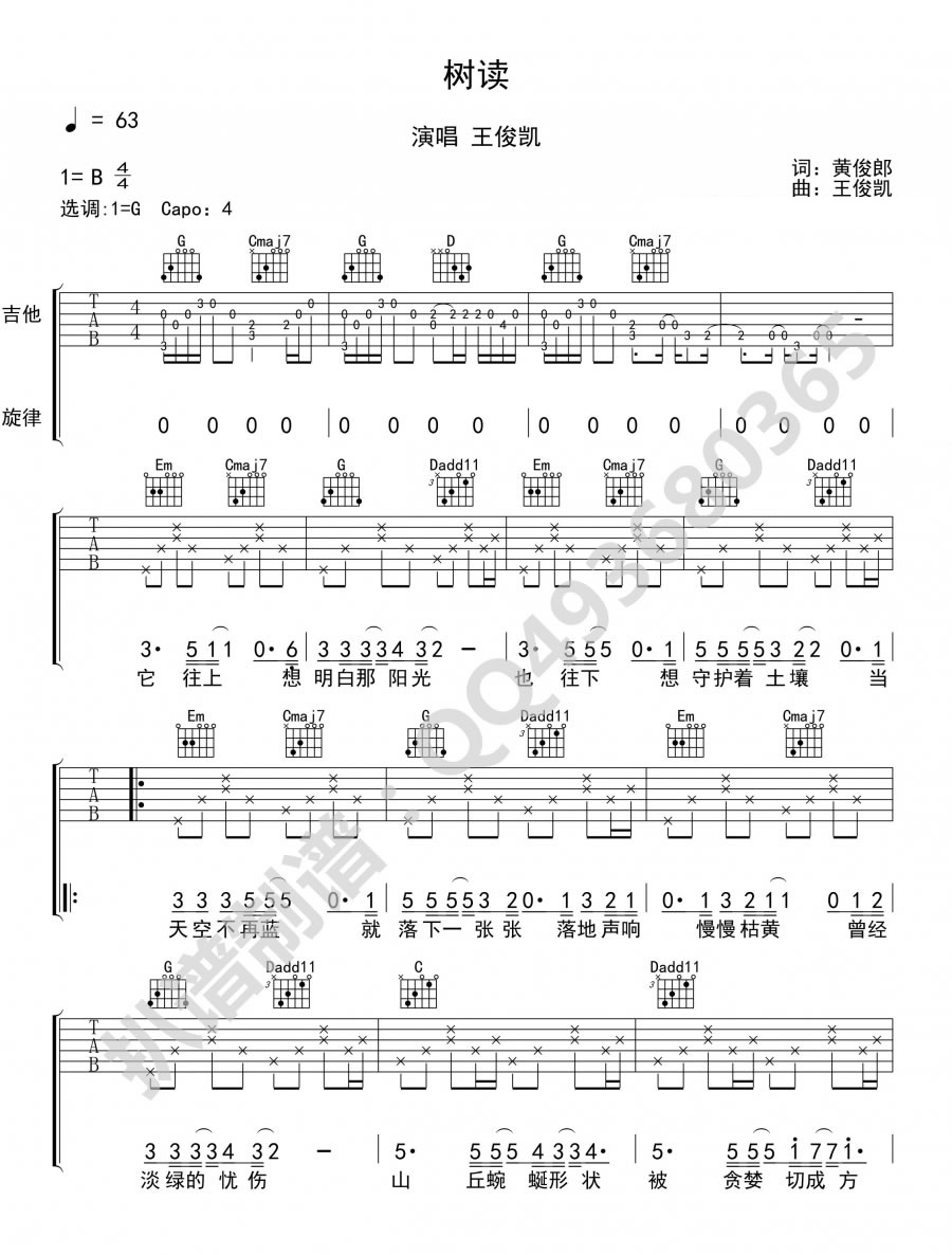 分享树读吉他谱,树读由王俊凯演唱,发行时间是2016-08-12,收录于专辑《树读》,由黄俊郎作词, ;