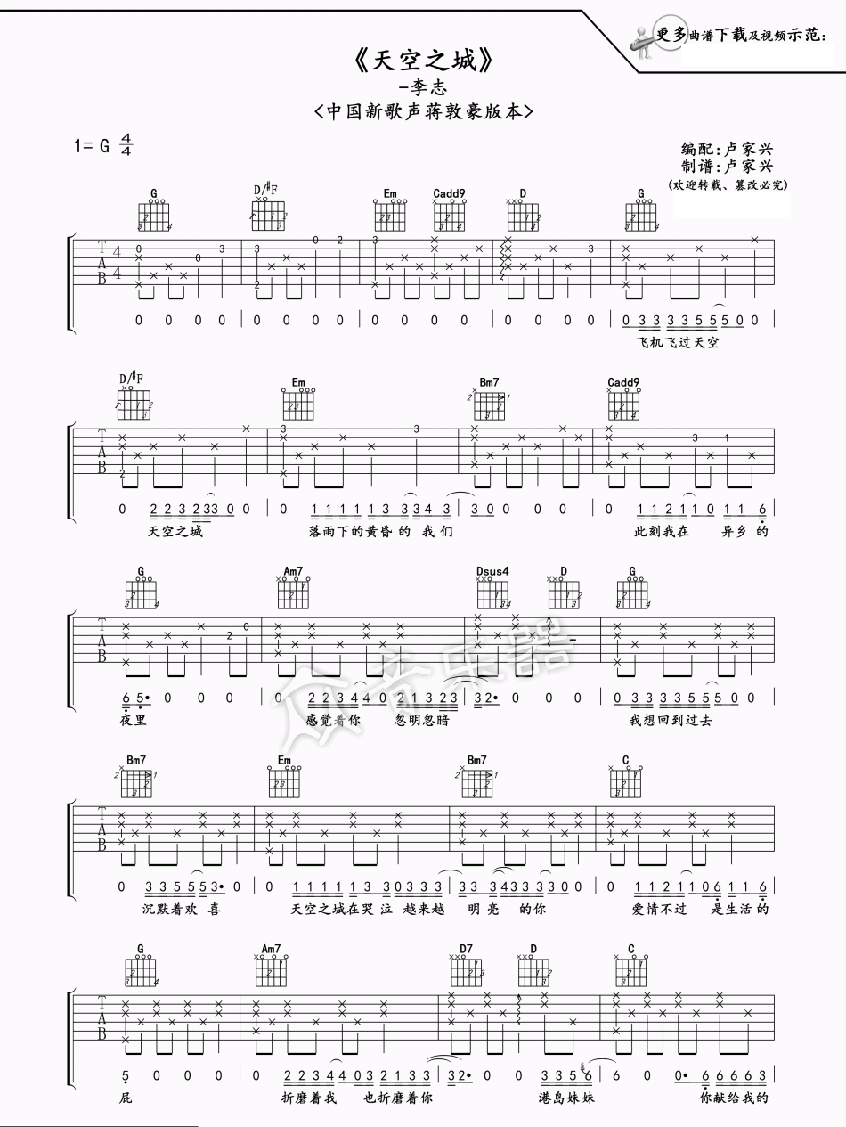 天空之城吉他谱,中国新歌声节目学员蒋敦豪演唱,天空之城吉他谱G调,六线谱编配,高清图片谱完整版共三张谱例。曲谱编配老师卢家兴如是说:“这首歌第一次听是几年前,听到一个非常喜欢李志的朋友在录音棚录的,当时就非常的喜欢,个人还是比较喜欢李志的版本,前天《新歌声》(原好声音)里蒋敦豪演唱了这首歌,又一次打动到我,嘿嘿,正好这两天刚好有人求这个版本的谱,索性就做了这个版本,喜欢的朋友自己转载吧,不用谢!”代表琴友们特别感谢分享。
