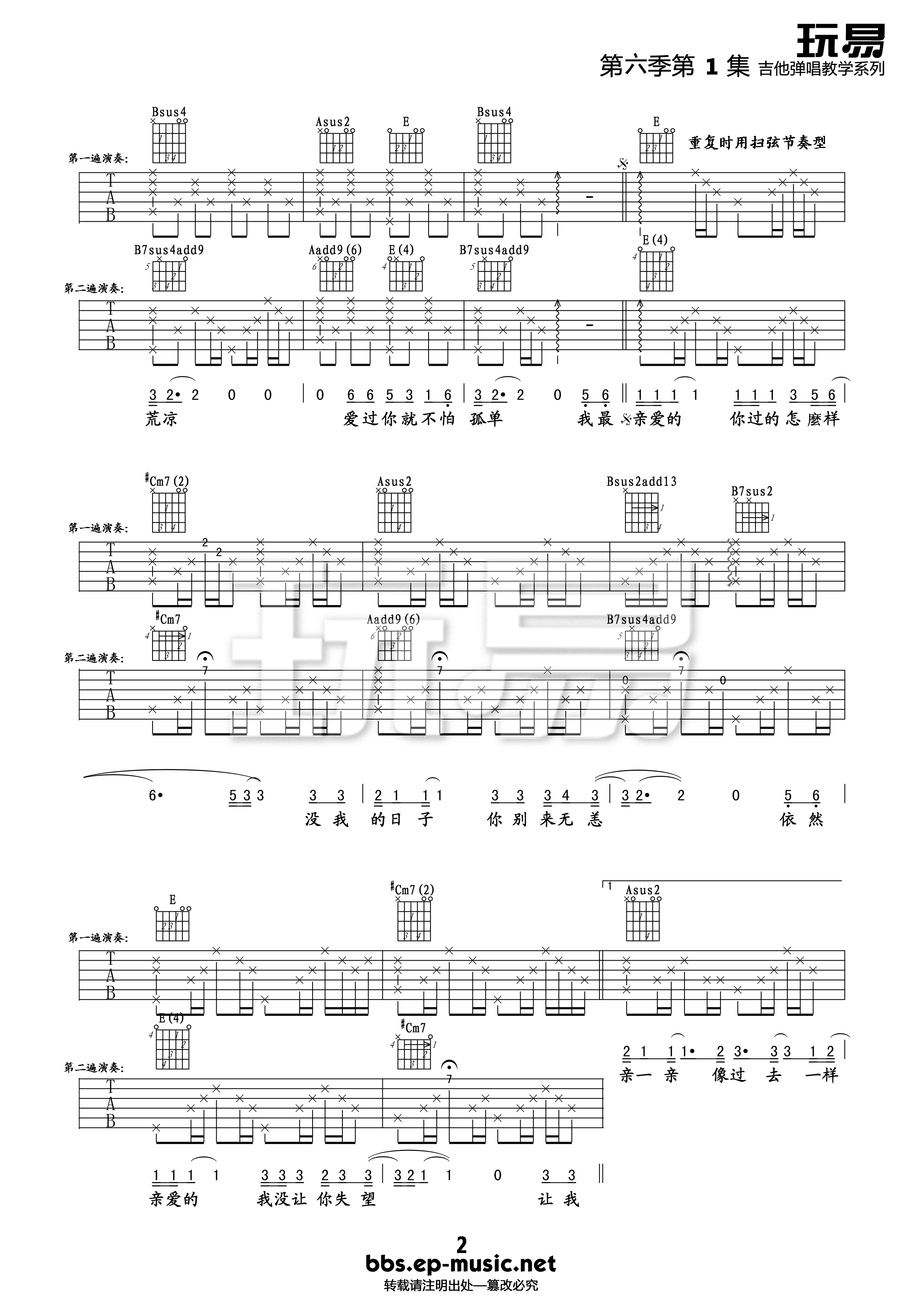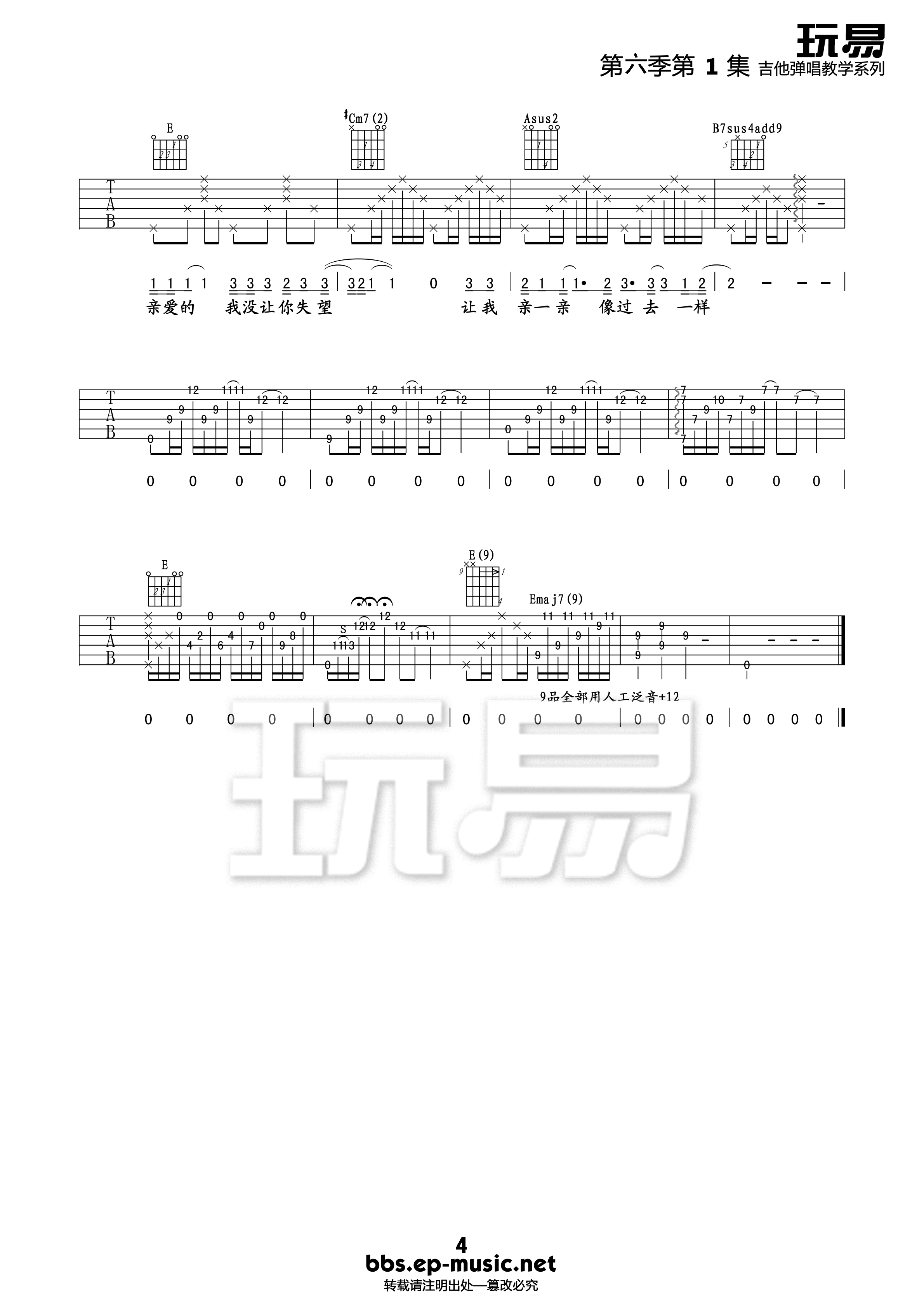 我最亲爱的吉他谱本曲谱是选用了E调指法,由玩易编配完成。这首《我最亲爱的》,由林夕作词,由张惠妹倾情演唱,精致伤感的歌词,搭配上歌手沙哑磁性的嗓音,传达出分别多年后的释怀与坦然,分手以后的我们,没有死缠烂打的撕扯,没有撕心裂肺的挣扎,就像是现实生活中的我们,有些东西,过去了就要果断放下,过分纠缠是会伤害自己,在温柔舒缓的节奏,在安静铺陈中静静诉说爱情哲学,让我们的心境得到了治愈。