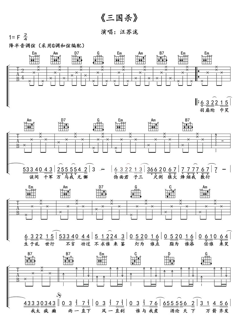 汪苏泷三国杀吉他谱,原调F调,降半音调弦,采用G调和弦编配,三国杀吉他弹唱谱,图片谱高清版。灵感来自于时下流行的桌牌游戏三国杀,曲风新颖耐听,一句“原来我一生戎马,三国你杀。”唱出了戎马之上,美人之下的悲苦惆怅。