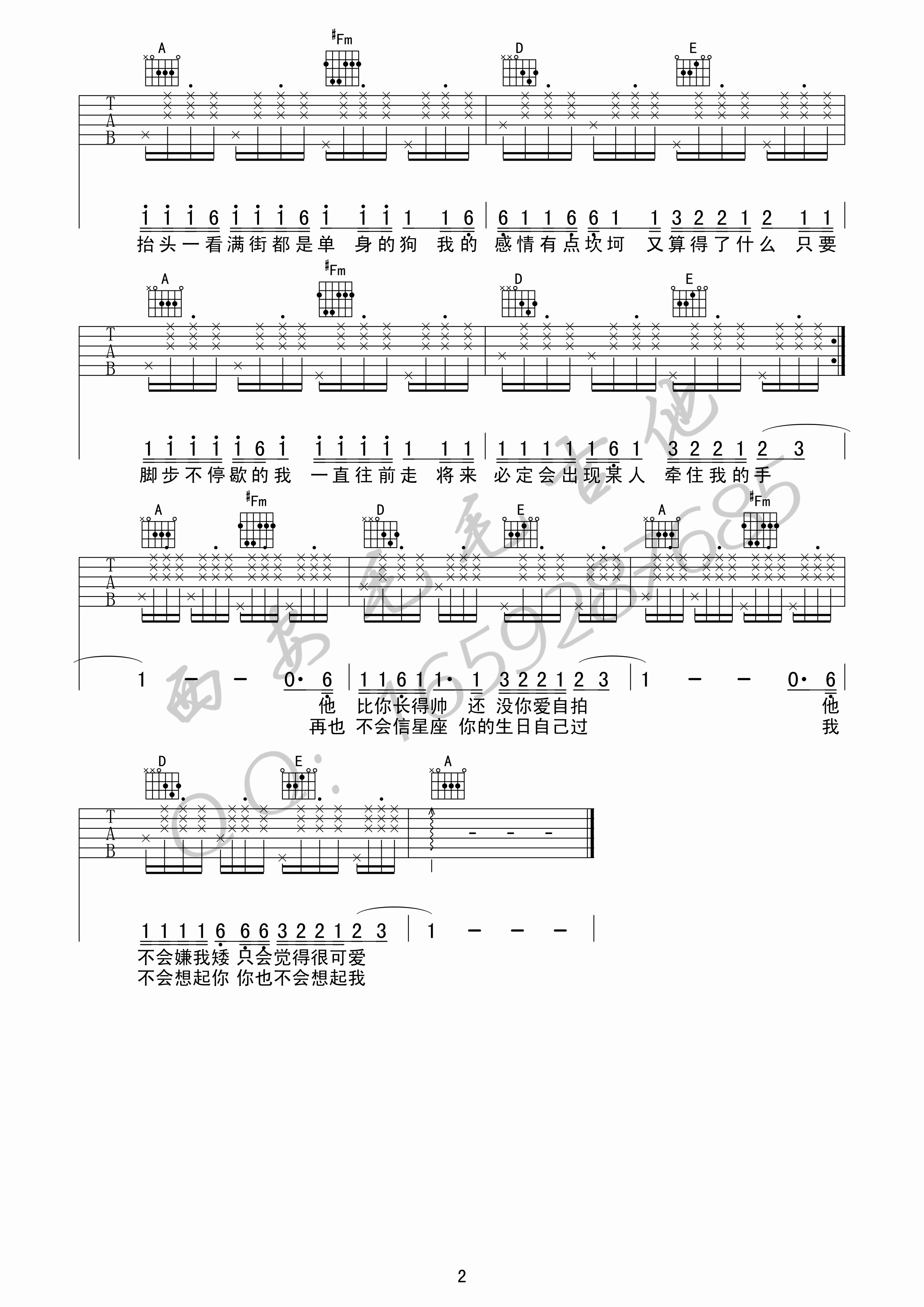 《我抬头一看满街都是单身狗 花粥 A调指法编配吉他谱》_群星_A调 图二