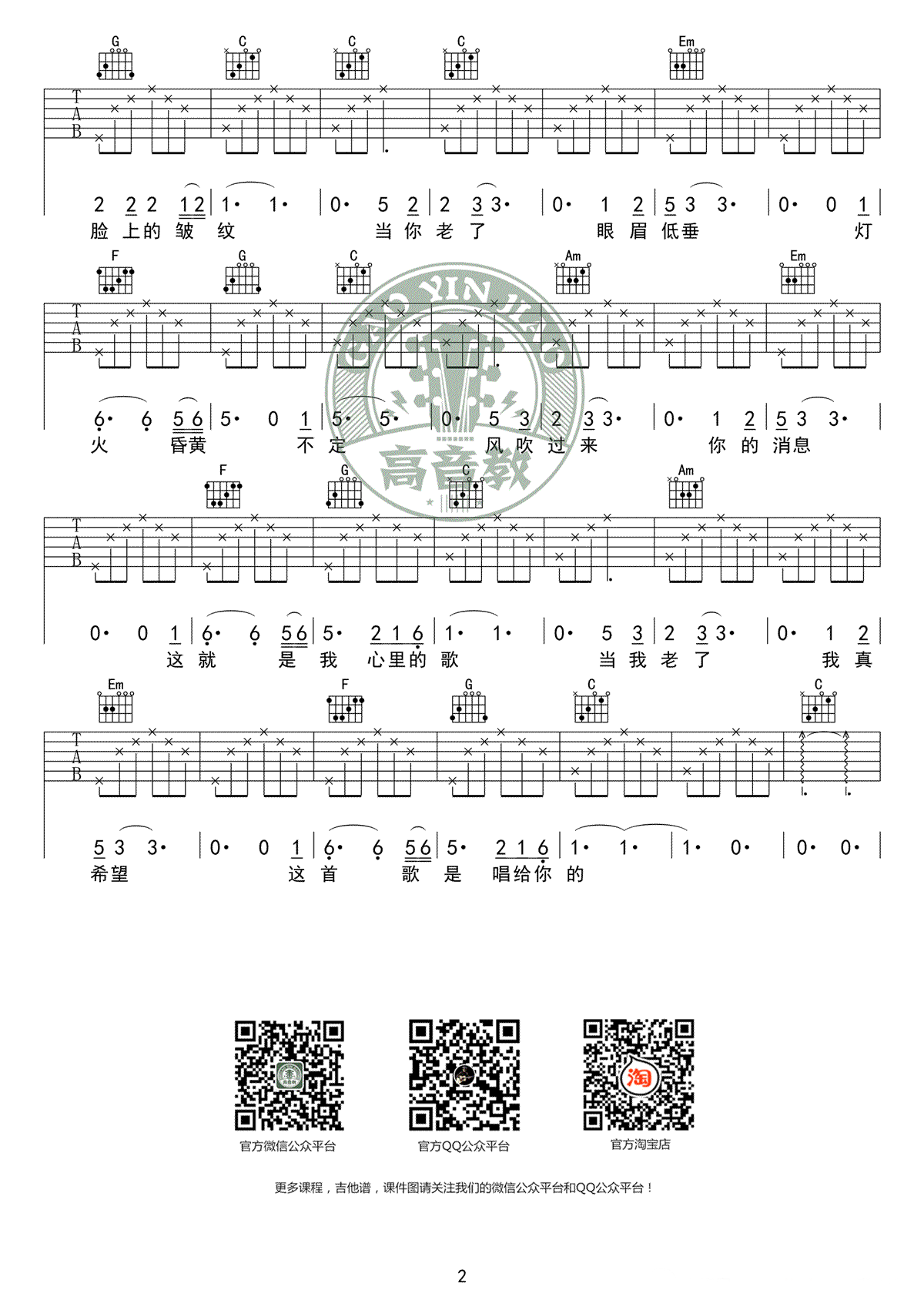 当你老了吉他谱,莫文蔚《当你老了》六线谱,选用C调指法,标准版编配,高清图片谱,感谢高音教的编配和弹唱教学视频提供,吉他部落 jita2012.com推荐分享。 一首根据英国诗人叶芝的诗歌改编的民谣歌曲《当你老了》唱出多少冬温夏清的温情。 Reaching_7120:所以这里都是非会员的小伙伴嘛? 游龙道长:穷人特供版《当你老了》 咯吱诗歌春: