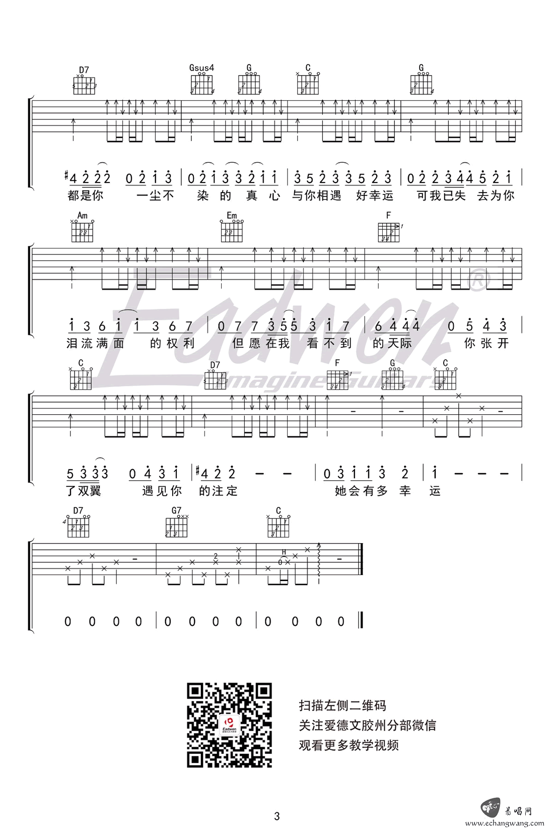 田馥甄小幸运吉他谱,它是田馥甄演唱的原版歌曲,歌曲的旋律抒情动人,让人心旷神怡.经典歌曲编配的三张指弹简单版吉他谱子,六线简谱是爱德文吉他制作,是非常好听的入门弹唱曲谱,下面为大家分享高清图片谱,有喜欢吉它的朋友欢迎关注!