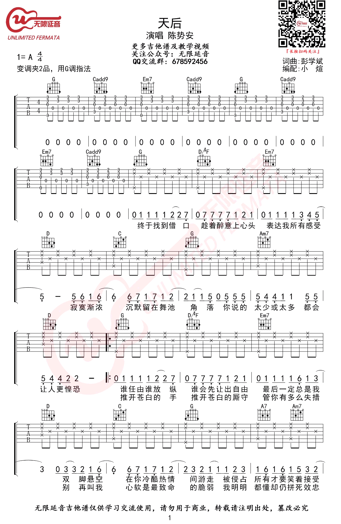 陈势安天后吉他谱,它是陈势安演唱的原版歌曲,它的旋律非常优美.经典歌曲编配的三张指弹简单版吉他谱子,六线简谱是无限延音制作,原调A夹二品是非常好听的入门弹唱曲谱,下面为大家分享高清图片谱,有喜欢吉它的朋友欢迎关注!