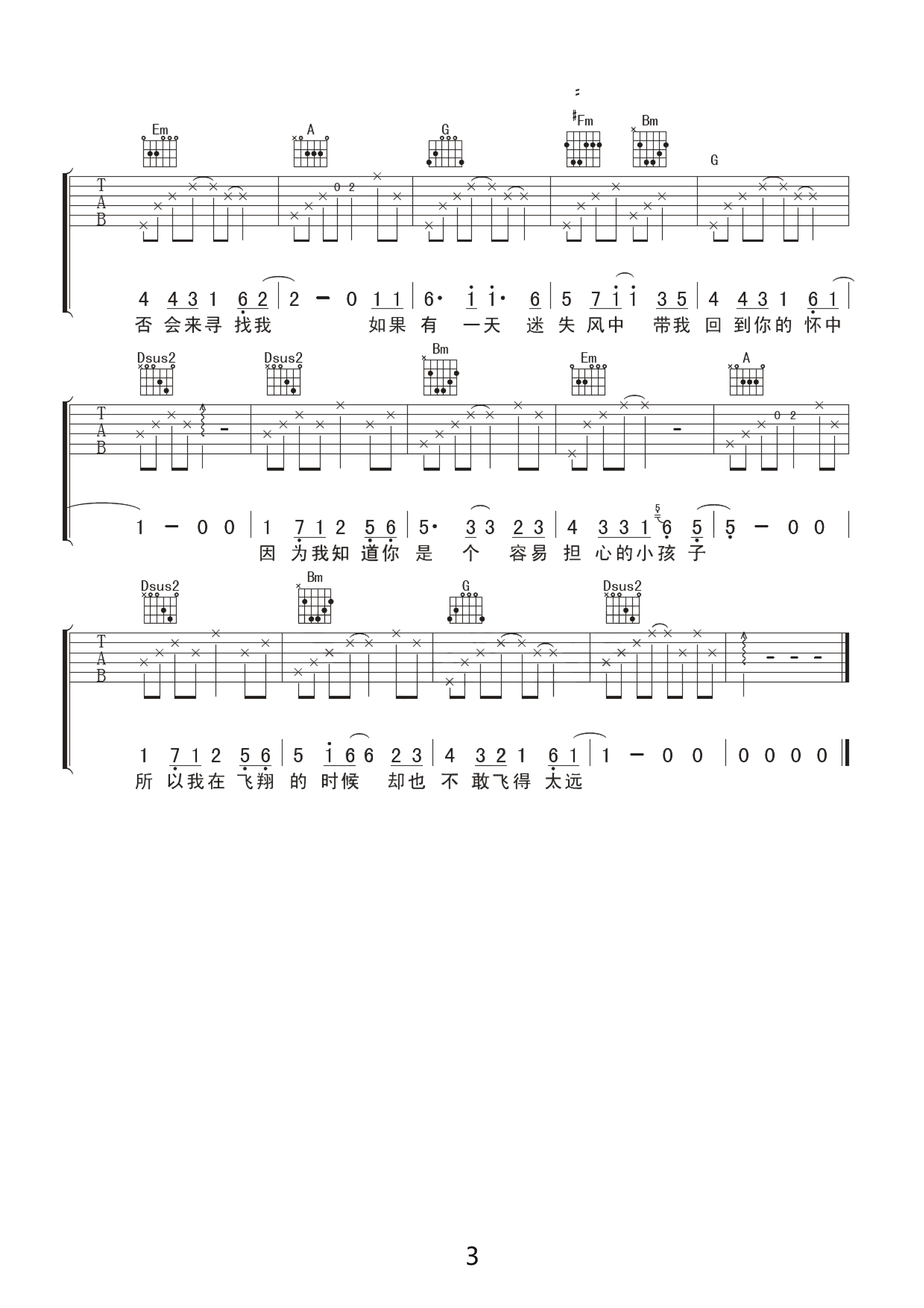 风筝吉他谱本曲谱是选用了E调指法,由smart _II编配完成。每个人小时候都很喜欢放风筝,当大人把线交到我们手里,让我们随风奔跑的时候,就是我们最开心的时候了,但是长大以后,我们好像离风筝越来越远了,我们再也找不到了那个时候放风筝的快乐,更确切的说,我们变成了那个风筝,像脱了线的风筝,没有了方向,但无论我们飞到哪里,家都是我们永远的依靠,永远的港湾。