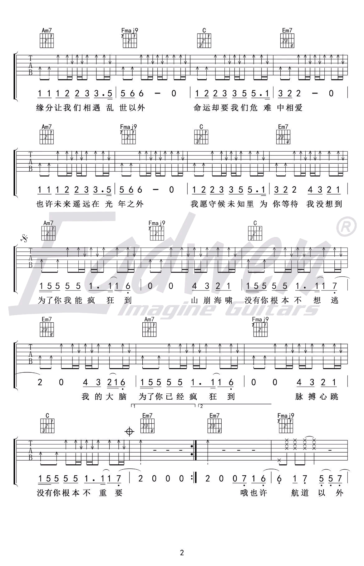 光年之外吉他谱,邓紫棋演唱,《太空旅客》电影中国区主题曲,不用太华丽的词藻去堆砌修饰,一开口就是很抓人心的歌曲。光年之外六线谱,选用C调,变调夹夹四品,高清弹唱图片谱,感谢爱德文吉他编配,吉他部落 jita2012.com上传分享。邓小呆queen_of_hearts:这首歌在itune上是要收费的,可是却免费给国人听[爱心]GEM邓紫棋资讯站:我不吸烟不喝酒,不泡酒