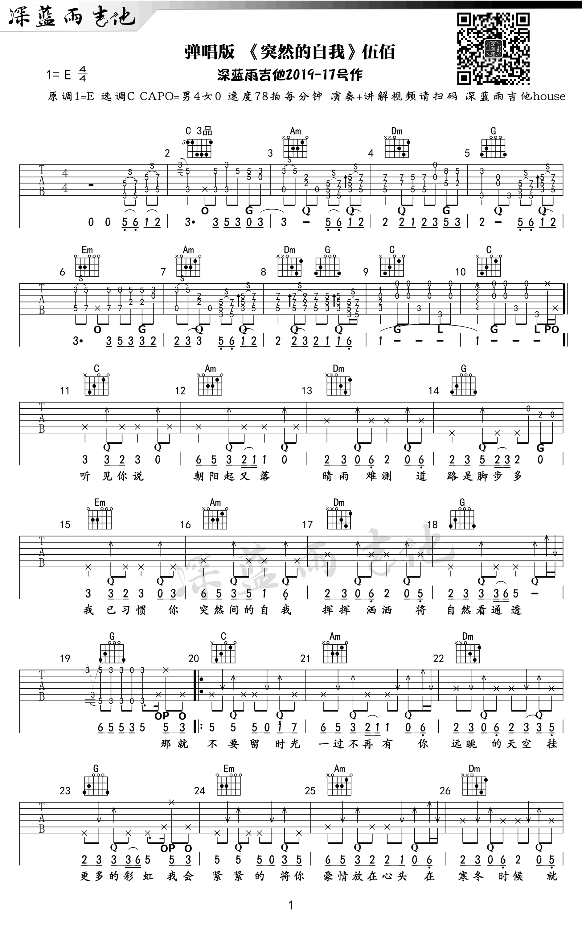 《突然的自我》吉他谱,伍佰一首经典代表歌曲,原调E,选调C,CAPO男生调夹四品,速度每分钟78拍。突然的自我六线谱,高清图片谱,深蓝雨吉他编配,随谱附上吉他演奏和讲解视频,琴友们参照老师的教学练习。 伍佰的代表作之一《突然的自我》,细腻温柔,动人心弦。外表粗狂不羁的摇滚歌手伍佰在这首歌曲里,没有了惯有的愤怒、伤感和嘶吼,虽然有