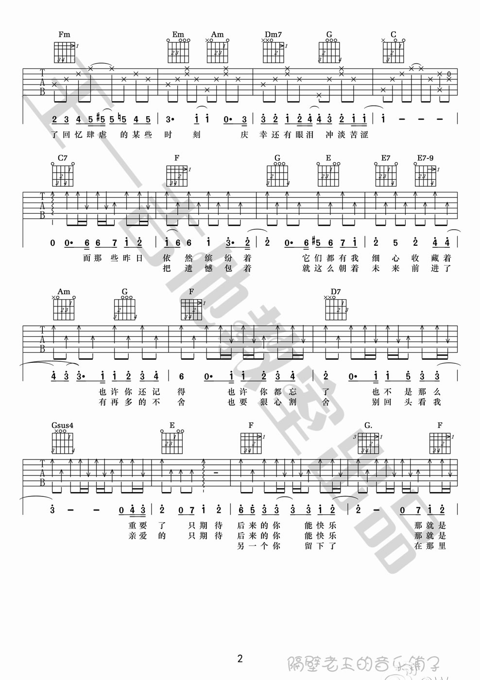 五月天 后来的我们吉他谱,C调指法编配,王一老师曲谱编配并带来弹唱教学视频。后来的我们吉他六线谱,五张图片谱分两页呈现。五月天团长怪兽的曲和阿信的词,相辅相成的合作。感性又煽情的歌曲,层层递进的旋律,调动听众的情绪,打动人心。苏如歌-:要是爱你爱得再少些,话就可以多说些。-《傲慢与偏见》帐号已注销:我当然知道
